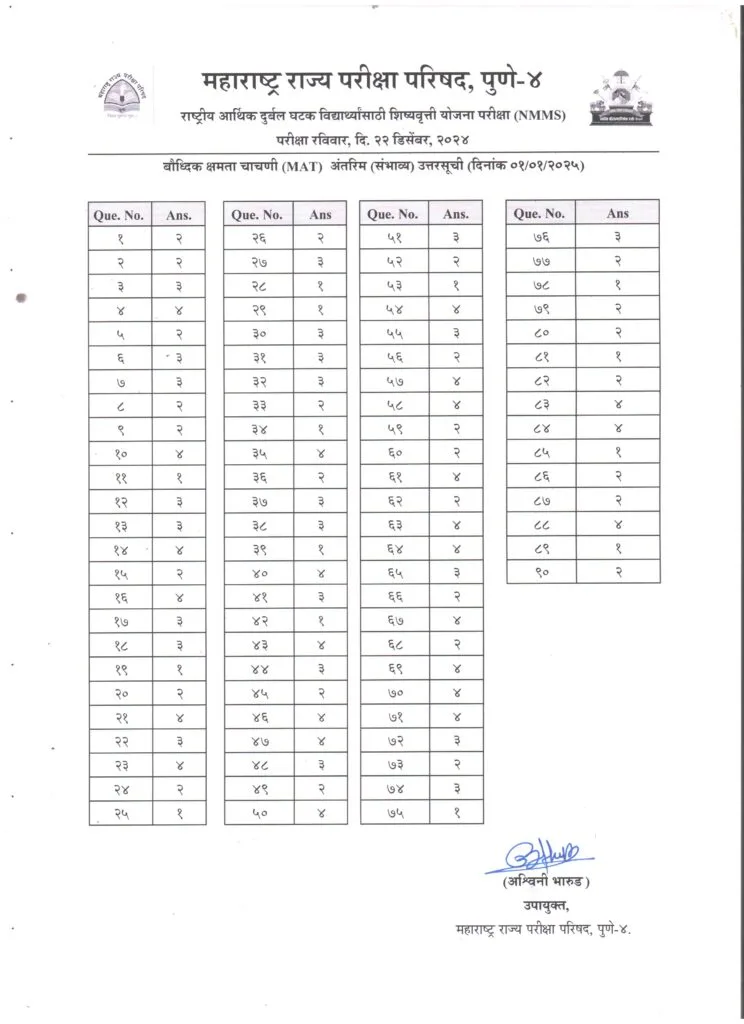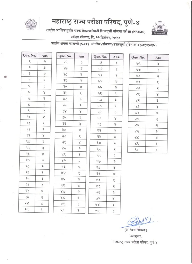 राष्ट्रीय आर्थिक दुर्बल घटक विद्यार्थ्यांसाठी शिष्यवृत्ती योजना परीक्षा (NMMS) रविवार दि. २२ डिसेंबर, २०२४ अंतरिम (संभाव्य) उत्तरसूची (Answer Key) प्रसिद्ध करण्यात आली असल्याचे प्रसिध्दीपत्रक महाराष्ट्र राज्य परीक्षा परिषद, पुणे यांनी जारी केले आहे. त्यानुसार खालीलप्रमाणे सूचना देण्यात आल्या आहेत.